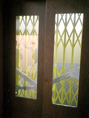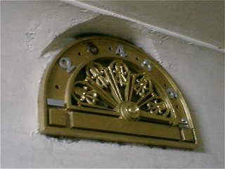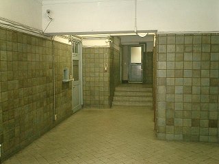 壁は細かいところまでスクラッチ状の模様が付けられて、屋上には、九段下ビルにもあった、西洋のお城を感じさせる波形の装飾(パラペット)のようなものが見える。 事前の調査によれば、どうも2つのビルは2つのビルが建てられた時期が異なっているらしく、外観からもその痕跡がわかる部分もあった。 建物全体が“直線的”なデザインだが、入口にある円い窓はちょっとしたアクセントとなって、とてもモダンな印象を与える。 入口ホールは、いたって実用本位ではあるが、微妙に異なったタイルの模様や色が、単調さを押さえてくれている感じ。思ったより天井は低くない。もちろん決して高いというほどではないけれど。 注目のエレベータはすぐ奥にあったが、これについてはのちほどじっくり見てみるとして、まずは階段を上がりながら建物内部を見学する。すぐに不思議な窓が目にとまる。