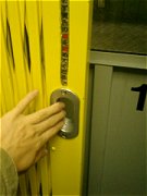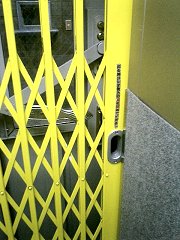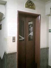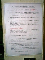 やってきたかごの扉を手で開けるが、これがかなり重い。しかも外側の「乗場ドア」と内側の「篭ドア」の2つをそれぞれ開けなければならないので、両手を使わないとスムーズに扉を開けることができないのだ。 篭の内部のボタンは、ごく普通のエレベータのそれと同じだが、よく見れば、扉の「開」「閉」ボタンがない。当然といえば当然だけど。かごの内部にも表と同じ注意書きと合わせて、更に大きな注意書きが掲示されていた。扉を閉めるのを忘れてしまう人も多いのだろ。エレベーターの扉を手動で開け閉めしたことがない人の方が、大多数なのだから、これまた仕方がないことだとは思うが。