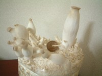 いよいよ表面全体が真っ白な菌糸に覆われてきた。その中で、エリンギではないかと思われる固まりを見つける。