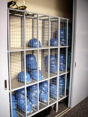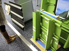 ![]() いま全日空では座席を取り替えている真っ最中らしく、真新しい座席が大量に並んでいた。新しい座席は、従来のものに比べて軽くできていたり、前の座席に入っている雑誌のポケットの位置が高くなって、膝が当たらないように工夫されているらしい。 ![]() 最後に作業員の工具箱を置く場所を見学。 工具箱には鍵がかかるようになっている。工具にも各自の名前が書かれていて、ひとつでもなくすことのないように厳重に管理されている。 もし機体の中に工具が残されたままだと、確かに飛行時に問題が起きるかもしれない。 |