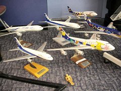 | 11時半に見学は終了。ヘルメットを返して、扉を出ると、そこは建物の玄関だった。 入ってきた時にはあまり気にしなかったが、ここにもいろいろ模型やかつて実際に使っていた操縦シミュレータなどが置かれている。模型には「絶対にさわらないで」と書かれていて、逆に何度も触られてしまったことを物語っているようだった。 売店もあって、飛行機に関するお土産などを買うことができるようになっている。「工場限定」といったものはないようだが、なぜか市価より若干安く売られている。 |
