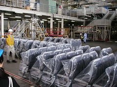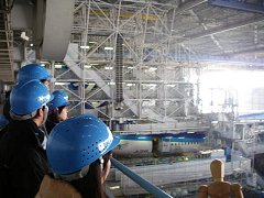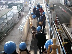 約40分ほどで講義は終了。教室後ろのロッカーに置かれたヘルメットをかぶって、いよいよ工場見学へ。 3つのチームに分かれる。係の人から所属するチーム(順番)の指示を受けて出発。 |