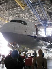 ![]() 工場は滑走路に向かって大きく開放されているで、次々と飛んでくる飛行機を目の当たりにすることができる。あいにく、飛んできたのが赤い垂直尾翼を持つ会社の便ばかりだったので、説明する係のお姉さんもちょっと気まずい?感じだった。 |