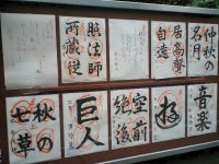 帰り道に見かけた書道教室の作品たち。この時期だけあって、季節感あふれる言葉が並ぶ。そのうち、もっとも印象に残ったのは、「巨人」だな。 |