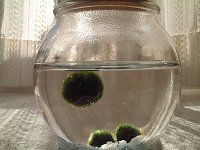 ついに浮いた! 今年の夏、北海道に行った際に買ってきた、まりも。ずっと沈んだままだったのに、今日初めて3つのうちの1つが浮いていた。別に沈んだままでも生育には全く問題ないけど、天候に応じて動くのは、なんとも楽しいもの。残る2つのまりもにも、空気がたくさんついてきたので、いずれ浮くんじゃないかな。 |