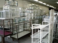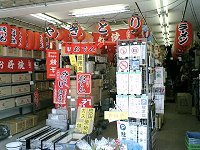 また普通の店では見られないような商品も多数見受けられ、興味を誘う。看板やちょうちん、「当店は備長炭使用しています」というものまであった。 歩道に置かれていた巨大な釜。ごはんなら500人前、みそ汁だったら1000人前ができるそうで、お値段は20万円とのこと。ちなみにもともとは卸売りのため、消費税は総額表示ではなくあくまで外税。 空っぽのショーケースが並ぶ店内。まるで倒産したかつぶれてしまい、商品がすべてなくなってしまったかのような、ここはショーケースのお店。
