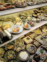 一番たくさんの人だかりができているのは、やはり食品サンプルを打っているお店だった。よく見かける寿司やラーメン、スパゲティーはもちろん、天ぷら、揚げ物、焼鳥、煮物、取れたてのカニや魚など…考え得るあらゆる食品がサンプルとして並んでいた。おもしろいところで、煮物で使うレンコンやタケノコのばら売りなどもあった。しかも、それぞれの形や大きさがバラバラなので、それこそ本物と見間違えそうなできばえだった。お土産用にオクラのイヤリングなどもあったが、さすがにこれは身につけるには勇気がいるような…