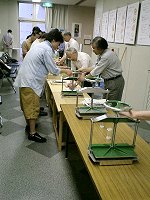 で、この王子には、世界的にも貴重な資料が集まっているという「紙の博物館」があって、今日はそこに行ってみた。入館すると、ちょうど今、手作り紙すき教室をやっているという受付の人に言われるまま、参加してみることにした。会場に行ってみると、思ったより(失礼)盛況で20〜30人くらいの人たちが、熱心に説明を聞いているところだった。こんなにたくさんいたら、なかなか思うように作るのも大変じゃないかなと思っていたら、製造工程にあわせて必要な道具がずらりと並べられていて、ベルトコンベア式に流れ作業でどんどんできるようになっていた。まさに洋紙が自動的に作られていく製造工程そのもののが目の前に展開されていたのだ。