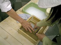 作り方はびっくりするくらいに簡単。すべての工程で、ひとりひとり係の人が付いている。かなり親切で丁寧な指導もあるので、わからない…なんてことは決してないだろう。待ち時間を除けば、すいてから圧縮、乾燥させ紙を手にする数分程度でできあがる。
