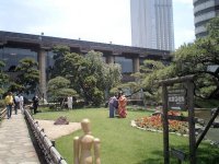 続いてホテルニューオータニに向かう。途中、舗装が完全でない歩道を歩いた。歩道の回りにはハルジオンが咲いている、なんとも都心とは思えない歩道を通り抜け、ホテルの日本庭園へ。ホテルとは何の関係もない自分たちのような客が自由に庭園に入れるようにしてくれているなんて、なんとホテルの太っ腹なことか。ホテルにある日本庭園はいくつか訪れているが、ここの庭園はそう広くはないものの、かなり立体的で変化に富んでいて楽しい。池の鯉がやたらお腹を空かしてたのが印象的。何匹かは飛び上がってた。