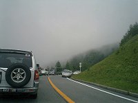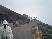 五合目に到着した時点でもそんなに天気はよくなかったが、さらに進んでいくと、ついにぽつりぽつりと雨が降り始めた。雲の動きが早い。なぜかあまり雨対策をしていなかったために、雨が降ってしまったら最後、濡れるしかない。山の天気は変わりやすい。こんな小雨などやむだろう…とたかをくくっていた。実際青空が見えているところもあるし。しかし、山は「そう甘いもんじゃない」。雨はどんどんひどくなり、ついには本降りになってしまった。さらにはなにやら白い固まりが落ちてきた。雹(ひょう)だった。