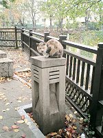 あとは巣鴨方面に歩いていくだけだ。大通りを避け裏の路地をゆく。ブロック塀の上に陣取った猫と目が合う。僕もまじまじと見つめると、このまるまるとした猫はすぐに面倒くさそうに、目をそらして前足で顔を拭いていた。なんだか時間の進み方がゆっくりだ。 |