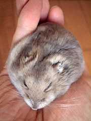 ハムスターのりぶは、最近手のひらの上で寝るようになった。しかも、額?から両耳の間を撫でてあげると、あっという間に寝てしまう。まったく、警戒心も何もあったもんじゃない。そのままにしておくと、いつまででも寝ているので、持っているこっちの方がくたびれてしまう。 |