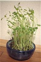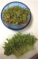 途中、一本とか二本くらいの芽がひょろりと伸びただけだったので「収穫ってこれかよ」と当惑する。が、最終的には右のような感じに。10cm〜15cmくらいに成長したので、炒めて美味しくいただく。ごちそうさま。 |