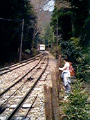 このころは、まだ足どり軽やかな?筆者とケーブルカー 結局1時間30分程度しかかからなかったのだけど、日ごろ体を使わないせいか、やはりきつい。ケーブルカーなら10分程度で山頂へ行くことができる。