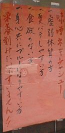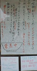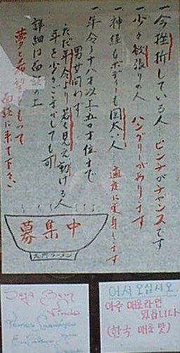 暑い夏に、熱い告知 ラーメン屋の案内2題。 上の案内は、味噌ネギチャーシューの広告。 一虚弱体質の方 一夏バテしやすい方 一食欲のない方 一心身ともにブルーになりやすい方 ”栄養剤みたいですみません” 〜おそらくこの広告を作っているうちに本人が気づいたのだろう。 あとは、この対象となるような人が、この店先を歩いてくれるのを待つばかりである。 下の案内は、社員?アルバイト?募集の案内。 一今挫折している人 一少々欲張りの人 一神経もボディも図太い人 一年令十八才以上五十才くらいまで 男女問わず ・ただ年令より若く見えて動ける人 その下には、ハングル文字と、アラビア文字?の案内もある。 あとは、この対象となるような人が、この店先を歩いてくれるのを待つばかりである。 |