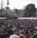 花よりスタァ? 東京はすっかり桜が満開になりました。そこで、お花見に出かけたわけです。浅草からすぐの隅田公園は、この日の天気も手伝って、大勢の見物客でにぎわっていました。 そんななかで、もっと賑わっていた場所に出くわしました。 一体誰だ? |