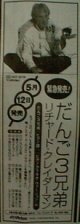 おいおい、あんたまで…(笑) 新聞を見て笑ってしまった。昨日の夕刊に掲載されていた広告なのだが、どうして、イージーリスニング界(そんな界があるのかは不明だが…)の巨匠、あの、リチャードクレイダーマン(彼の作品である”渚のアデリーヌ”は、あまりに有名)が、”だんご3兄弟”を演奏しなけりゃならないんだろう…ブームもここまで来たか… …でも、すでにだいぶ落ち着いてきたようではあるけどね… |