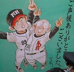 やっぱりセール? 優勝が決まると、何より関心が高まるのが、日本一がどこになるのかという期待と優勝セール。初優勝であるダイエーにとっては、初めての経験となるわけで、ものすごい賑わいを見せていた。 この、おそらくは、水島新司が描いたと思われるイラストの左は王監督だろう。で、一緒に喜んでいるおじいさん…右は、中内オーナーかな? 巨人だったら、あり得ない構図だなぁ(笑) (なお、撮影は、26日の午後) |