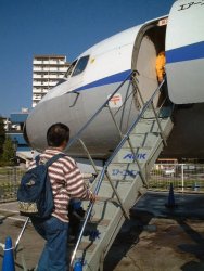 ちょっと名残惜しいが、外に出てみる。地上から機体までの高さが低いために、機体に備え付けのタラップを使って、直接地上に降りる。これまでこうした飛行機に乗ったことがなかったから、とても新鮮だった。