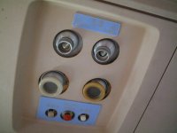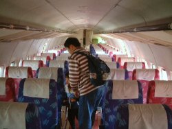 機内は就航時そのままの雰囲気が保たれていた。 機内の設備は、読書灯くらいしかなく、まるでちょっと昔のバスのイメージ。 右の写真は、座席から見上げたところで、上から空調の噴出口と読書灯、一番下は読書灯のスイッチと、中央の赤いボタンは、客室乗務員の呼び出しスイッチ。呼び出す際は、押すのではなくて、手前に引く。