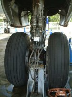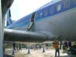 初飛行から30年以上も飛び続けただけに、さすがに古めかしい感じが至るところでするけれど、逆にそれが、安心感というか、信頼できる飛行機というイメージを作ってる。 飛行機の車輪を間近で見る機会なんて、そうめったにあるもんじゃない。当然だが、ただ軸にタイヤが2個ついているわけじゃなく、なにやら複雑な仕掛けを目にすることができた。