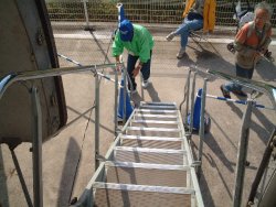 振り返って、タラップを降りる人と比べると、そのバカでかいプロペラを改めて実感できる。直径は4m以上あるらしい。 こうして見ると、機体本体より、プロペラのほうが大きいことがわかる。