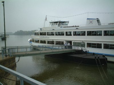 踏切待ちのあと、桟橋を渡り、ライン川遊覧船へ。ライン川はスイスからオランダの北海まで流れる、全長1320km、流域面積は日本の本州と同じくらいの22.4万平方キロ。この遊覧船では、ドイツの中でも特に古城が多い地域である25kmを遊覧できる。