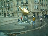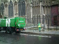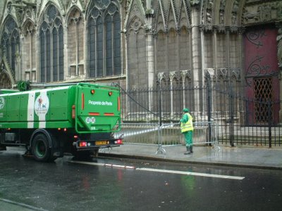 かなり豪快な清掃作業。奥はノートルダム寺院。放水車から、勢いよく水を吹き出し、枯れ葉やゴミを集めていく。人に当たらないのか、他人事ながら心配になった。