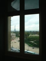窓から遠くにエッフェル塔が見える。 |
