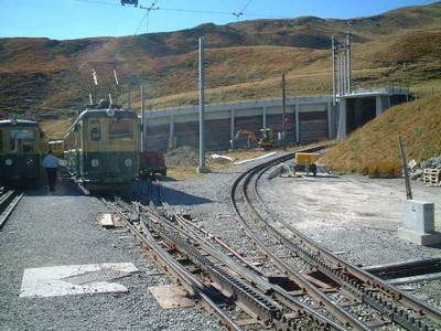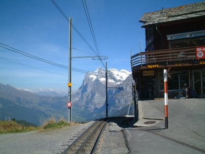 クライネシャイディック駅付近の風景。 全区間でもっとも高い位置にある。降雪にも耐えられるよう車庫にはシェルターが備えられている。ユングフラウ鉄道へは駅舎を挟んで反対側に位置する。 |