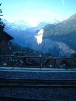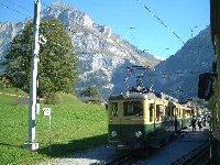 ラウターブルンネンを出発した列車は、その短めな車両をきしませながら、一路、クライネシャイディックを目指す。 もちろん、素晴らしい景観の連続であるのは言うまでもなく、落差300mのシュタウプバッハ(滝)や、その奥に控えるグローズンホルン(3762m)が眺められる。【写真右】 |