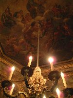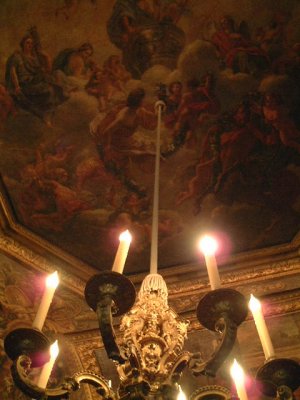 聞いた話によると、現在つられているシャンデリアのほとんどが、当時の資料に基づいて、復元されたものとのことだったが、この写真のものは、わずかに残されたシャンデリアの一つとのこと。(写真左) |