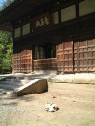 浄智寺 北鎌倉駅から鎌倉市内方面に歩くこと数分。案内標識に従って、脇道を右にそれると、浄智寺。車の往来の激しい鎌倉街道を一歩入っただけで、いきなり落ち着いた雰囲気になる。そりゃ、猫もすっかりくつろぐってもんだ。で、のちのち気づくのだけど、鎌倉市内は猫が多いような気がする。なんとなくだけど。 寺の由来などのご紹介は他の資料に譲るが、あまり目立った寺ではないけれど、名刹と呼ばれるにふさわしい感じの寺だった。 |