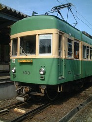 移動は江ノ電で 鎌倉から江の島への移動は、やっぱり江ノ電。 2002年9月に開通100周年を迎える歴史の長い鉄道。わが国に現存する電気鉄道の中で、京浜急行大師線、箱根登山鉄道に次いで、3番目に古い。(開業当初から電車運転していた路線として) 民家の軒先を縫うようにして走ったり、突然、道路との併用軌道になったりと、まるで模型みたいな雰囲気。 |