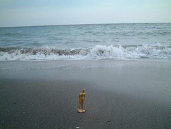 稲村ヶ崎へ ちょっと寄り道して、海に出てみた。ダミーにとっては初めての海かも知れない。天気が曇ってきたせいか、人はあまり多くないようだった。もっと 波打ち際にダミーを連れて行こうとしたが、波にさらわれてしまったら、元も子もないので、この辺にしときました。 |