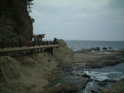 「岩屋」到着 江の島の一番奥まで来た。「岩屋」と呼ばれる波の浸食でできた、自然の洞窟。古くから信仰の対象とされてきたが、崩落の危険があるということで昭和46年に閉鎖されたが、平成5年に藤沢市によって再開されたとのこと。二つの岩屋がある。入洞料500円。 写真は暗くてよく写らなかったので、ここでは割愛した。 ![]() 「亀石」 第一岩屋と第二岩屋の間にある、有名な「亀石」。潮位によっては、もっと亀らしく見えるんだけど。亀から海に泳ぎだそうとしているように見える。 |