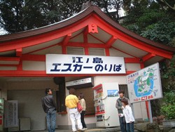 江ノ島エスカー 江ノ島といえば、エスカー・・・というと大げさだが、この存在感は、妙に大きい。もし、江ノ島をご存じない方でも、このエスカーとは何であるかは、おおよそ見当は付くとは思うけど・・・そうです。エスカレーター。そりゃ階段よりラクだけど、エスカレーターのためにお金を払うって言うのは、どうも抵抗があるな。 ※ 写真は帰りがけに撮ったので、シャッターが降りている。 |
