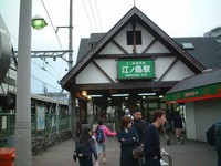 ![]() いよいよ江の島へ 稲村ヶ崎から、再び江ノ電に乗り、江ノ島駅(写真は帰りがけに撮影)へ。江ノ島駅から、ほとんど歩行者専用の道路を歩くこと数分。遠くに江の島が見えてくる。 江の島へは歩行者専用橋の江ノ島弁天橋を渡る。途中で、江の島の裏手にある「岩屋」までの連絡船が、\300円であるけれど、とりあえず、徒歩で行って、帰りに利用しようということにした。 |