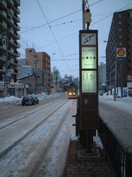 路面電車の停留所に来た。しばらく待っていると電車がやってきた。 |