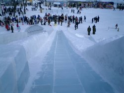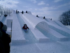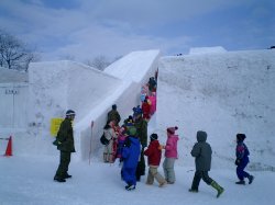 すべり台のすべる部分は、氷そのものなので、ものすごいよくすべる。すべり台の下の雪山がなかったら、どこまででもすべっていってしまいそうだった。 |