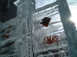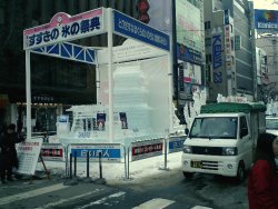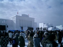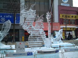 この氷像は、交差点の端にあったので、みんな、車が通らないところを見計らって写真を撮っていた。 |
