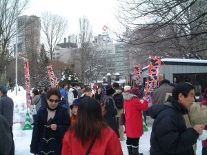 積丹ののぼりが出ていて、観光協会のイベントのようだった。並んでいる人の話では、鍋の無料配布をするらしく、10分くらい並べば、もらえるとのこと。