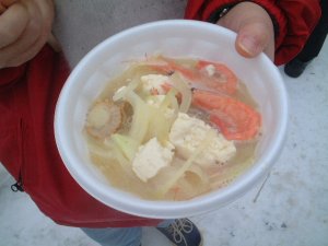 エビが2、3尾と大きな鱈、ホタテがたっぷり入った鍋をgetすることができた! 冷えた身体にしみわたるようで、懐も暖かく感じたとさ。