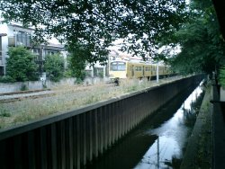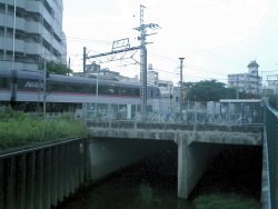 西武新宿線が、武蔵関駅を下り方向に向かってすぐのところで、石神井川をまたぐ。なぜか突然川幅が広くなっていた。川を覆う部分は、自転車置き場になっていた。 |