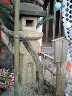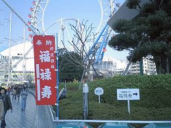 実際に東京ドームのどこにあるのだかわからなかったので、案内所で聞いてみた。尋ねる人が多いのか、すぐにすらすらと場所を教えてくれた。行ってみると、やはりのぼりが立っていて、福禄寿の存在をアピールしていた。コンクリートとタイルばかりの景色の中で、脇の方に庭園になっている場所があって、そこに福禄寿がおられた。