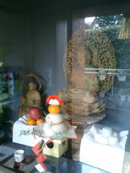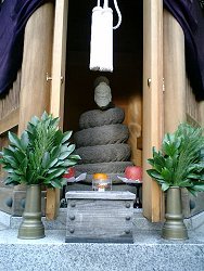 次の真珠院はこれまでのお寺と違って、かなり近代的なビルだった。で、ここにいるという布袋尊は、正面の近代的なビルではなく、ビルの向かいにある小さな建物の中にいらっしゃった。ガラス越しなので、写真が撮りにくかった。