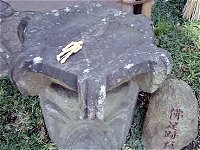 他には、これといって特徴はなかったのだけれど、境内脇に「仏足跡」という石が置いてあって、確かに足跡らしき凹みがある。ダミーの大きさから比較してもらえるとわかると思うが、おおよそ30cmくらい。仏さまの大きさというのは、奈良とか鎌倉の大仏をイメージすればよいのだろうか? オフィシャルの仏さまのサイズってどれくらいなのかな?
