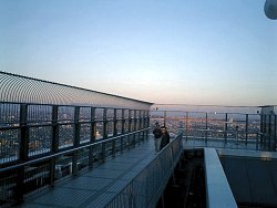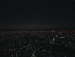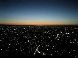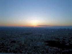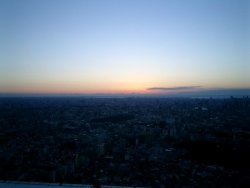 地上240mという高さのせいか、かなり寒い。時間が経つにつれて、寒さが身体の芯にまで伝わってくるような感覚。とにかく、初日の出の瞬間まで待つ。東京の初日の出は、6時51分頃ということだが、この展望台では、高さがある分ほんのちょっと早く、6時48分頃とのこと。とにかく寒いので、少しでも早まってくれないかと本気で思った。しかし、雲ひとつないいい天気なのに、地平線(水平線)のあたりには、うっすら雲がかかっていたためか、予定の時間になっても、太陽は現れなかった。