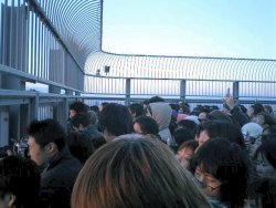 下の写真は、腕を上に伸ばして自分の右側〜後ろ側(南側)撮ったものだが、かなりの人たちが、カメラ付き携帯電話で写真を撮っている。考えてみれば、なんとも不思議な光景。 |